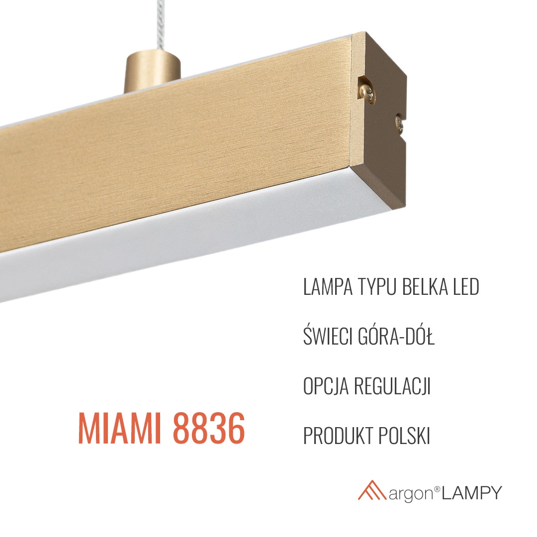 Lampa wisząca LED pojedyncza, świecąca góra-dół MIAMI (8836) od marki Argon to idealne rozwiązanie dla osób, które cenią sobie nowoczesny design i funkcjonalność. Jej minimalistyczny wygląd sprawia, że doskonale wpisuje się w różnorodne aranżacje wnętrz, od stylu loftowego po klasyczną elegancję. Wykonana z wysokiej jakości stali, lampa wyróżnia się złotym wykończeniem, które nadaje każdemu pomieszczeniu odrobinę luksusu. Model ten to doskonały wybór dla tych, którzy poszukują lamp wiszących, które będą nie tylko oświetleniem, ale również efektownym elementem dekoracyjnym.