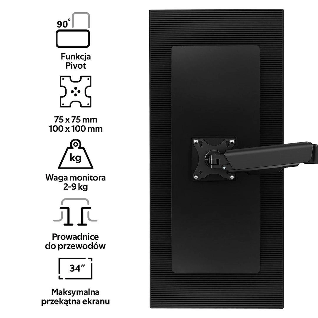 Regulacja uchwytu odbywa się w każdych płaszczyznach – od wysokości monitora, przez kąt nachylenia, aż po orientację poziomą lub pionową. Funkcja Pivot umożliwia obrót ekranu o 90 stopni w prawo lub lewo, co jest szczególnie przydatne podczas pracy z dokumentami w pionie. Dodatkowo, pełny obrót ramienia o 360° pozwala na łatwe dostosowanie pozycji monitora do indywidualnych potrzeb użytkownika.