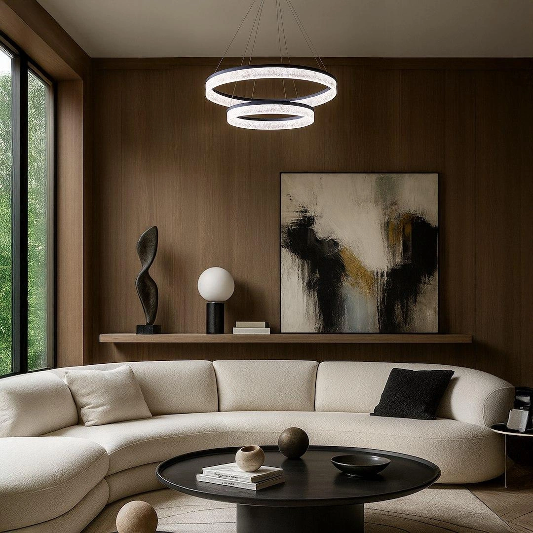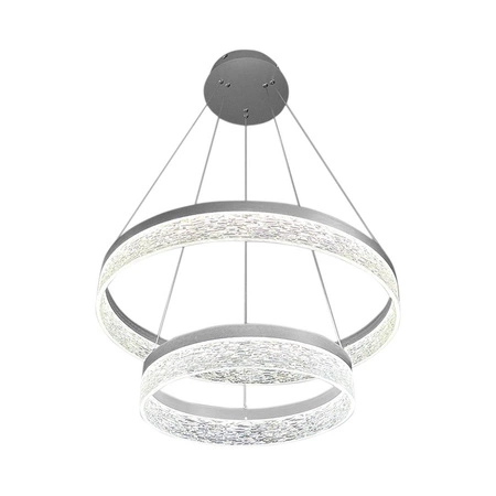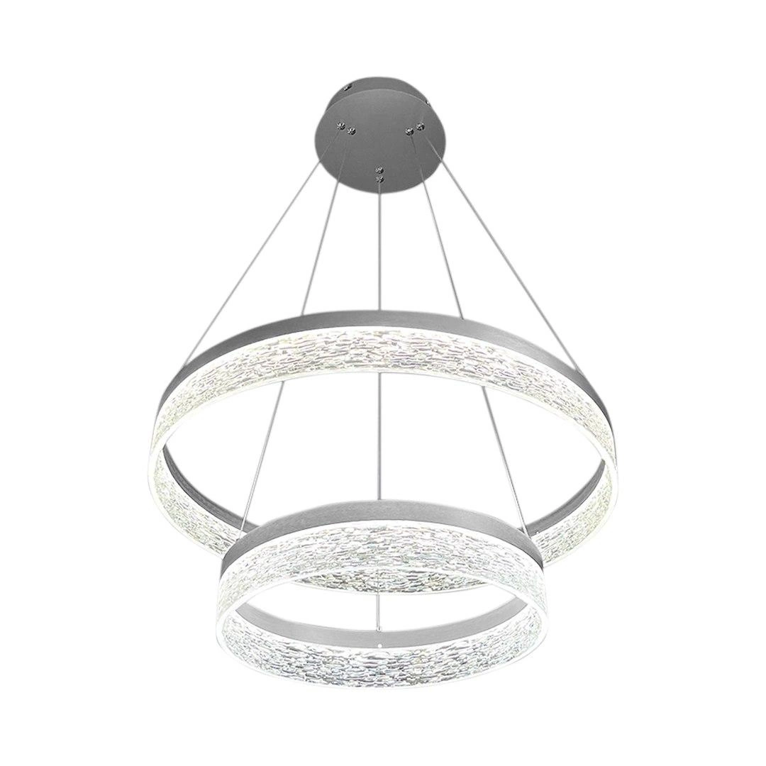 GALA SILVER 54W LED to wyrazista i nowoczesna lampa sufitowa o podwójnej obręczy, która przyciąga wzrok i nadaje wnętrzu charakteru. Dwa świetlne pierścienie o różnej średnicy zawieszone są na cienkich stalowych linkach, tworząc spektakularny, trójwymiarowy efekt. Dzięki mocy 54W i zintegrowanemu modułowi LED, lampa oferuje intensywne, a zarazem przyjemnie rozproszone światło – idealne do dużych pomieszczeń mieszkalnych i komercyjnych. Połyskliwa struktura wewnętrzna kloszy dodaje elegancji i subtelnego błysku.