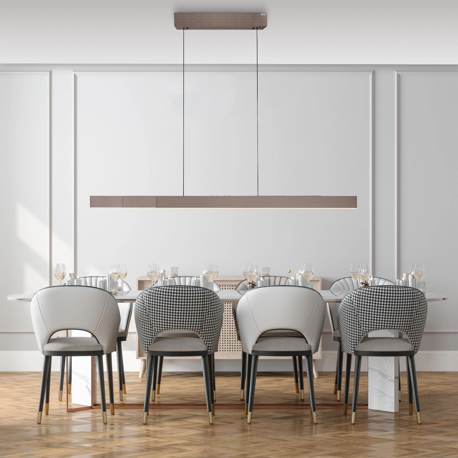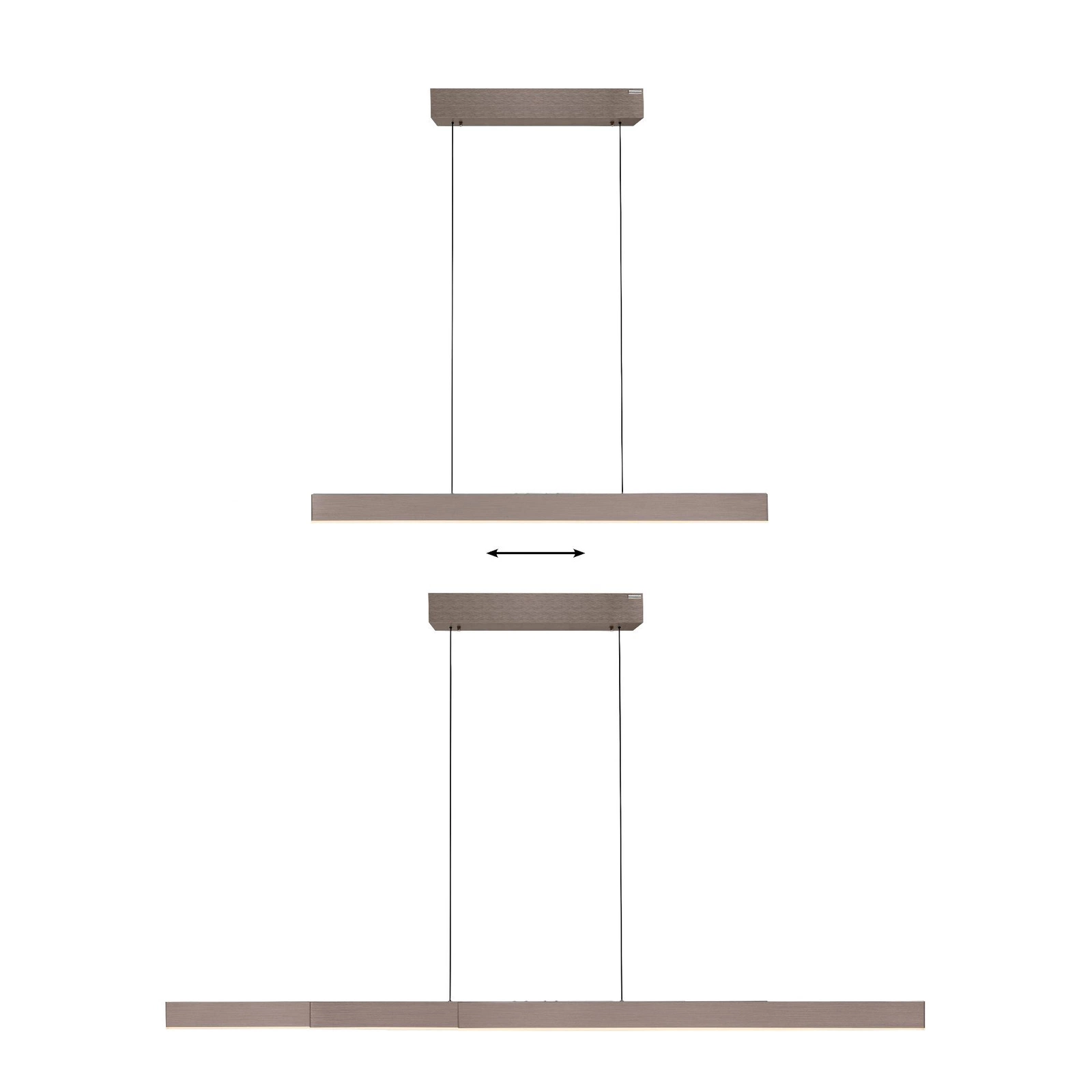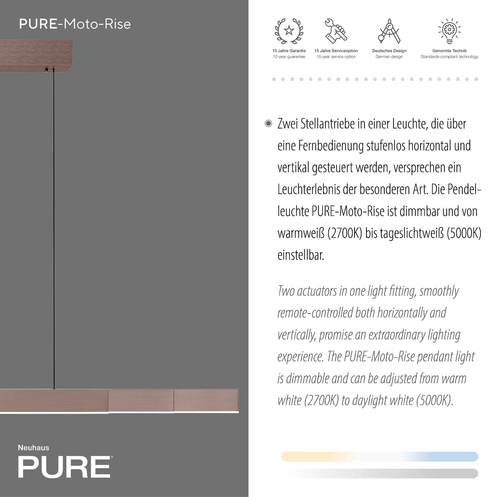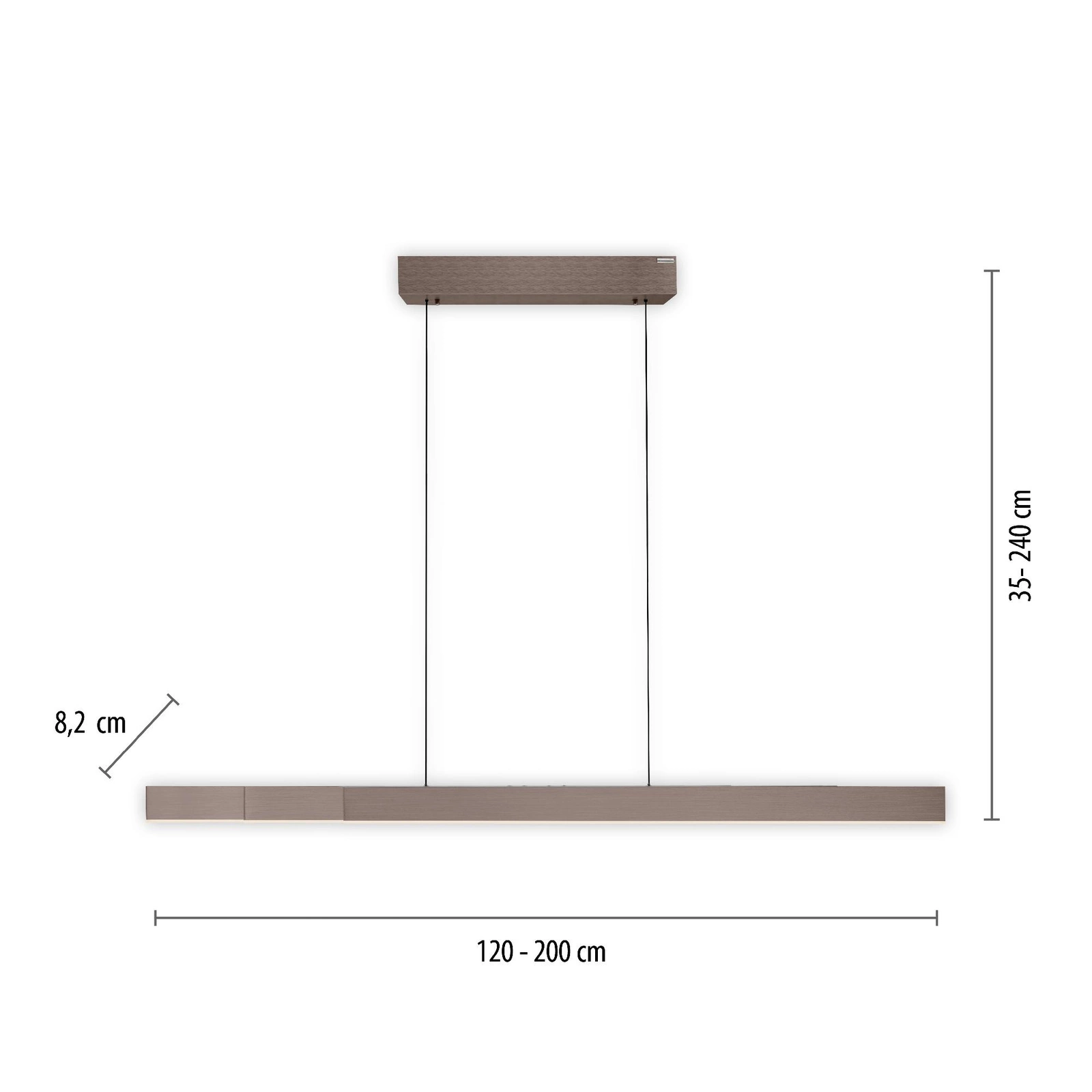 PURE-MOTO-RISE BRĄZOWA charakteryzuje się wyjątkową funkcjonalnością, dzięki płynnej regulacji wysokości oraz szerokości połączeniem z innowacyjnym systemem E-Lift, który można łatwo obsługiwać za pomocą dołączonego pilota. Z łatwością dostosujesz ją do swoich potrzeb – czy to nad stołem, czy nad wyspą w kuchni. Poczuj swobodę w aranżowaniu przestrzeni!