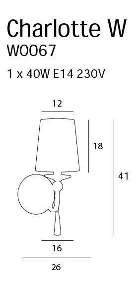Parametry techniczne kinkietu CHARLOTTE (W0067) również zasługują na uwagę. Lampa wymaga jednego źródła światła na trzonku E14, o maksymalnej mocy 40W. Z napięciem zasilania 230V i klasą ochrony IP20, kinkiet stworzony jest do użytku wewnętrznego. Dzięki prostej instalacji, kinkiet wewnętrzny staje się funkcjonalnym elementem wyposażenia, który można łatwo zamontować w różnych miejscach.