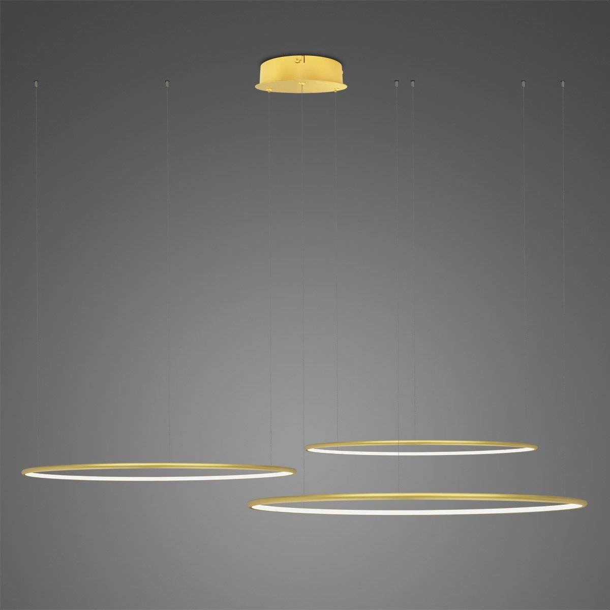 Lampa wisząca Ledowe Okręgi No.3 od renomowanej marki Altavola Design to znakomity wybór dla osób poszukujących eleganckiego i nowoczesnego rozwiązania oświetleniowego. Oferowana w kolorze złotym, lampa o średnicy Φ80 cm z serii Led shape doskonale wpisuje się w trendy nowoczesnych lamp wiszących, stanowiąc oryginalną i stylową dekorację wnętrz. Jej minimalistyczny, a zarazem efektowny design sprawia, że idealnie nadaje się do salonu, jadalni oraz kuchni, wprowadzając do nich nową jakość światła.