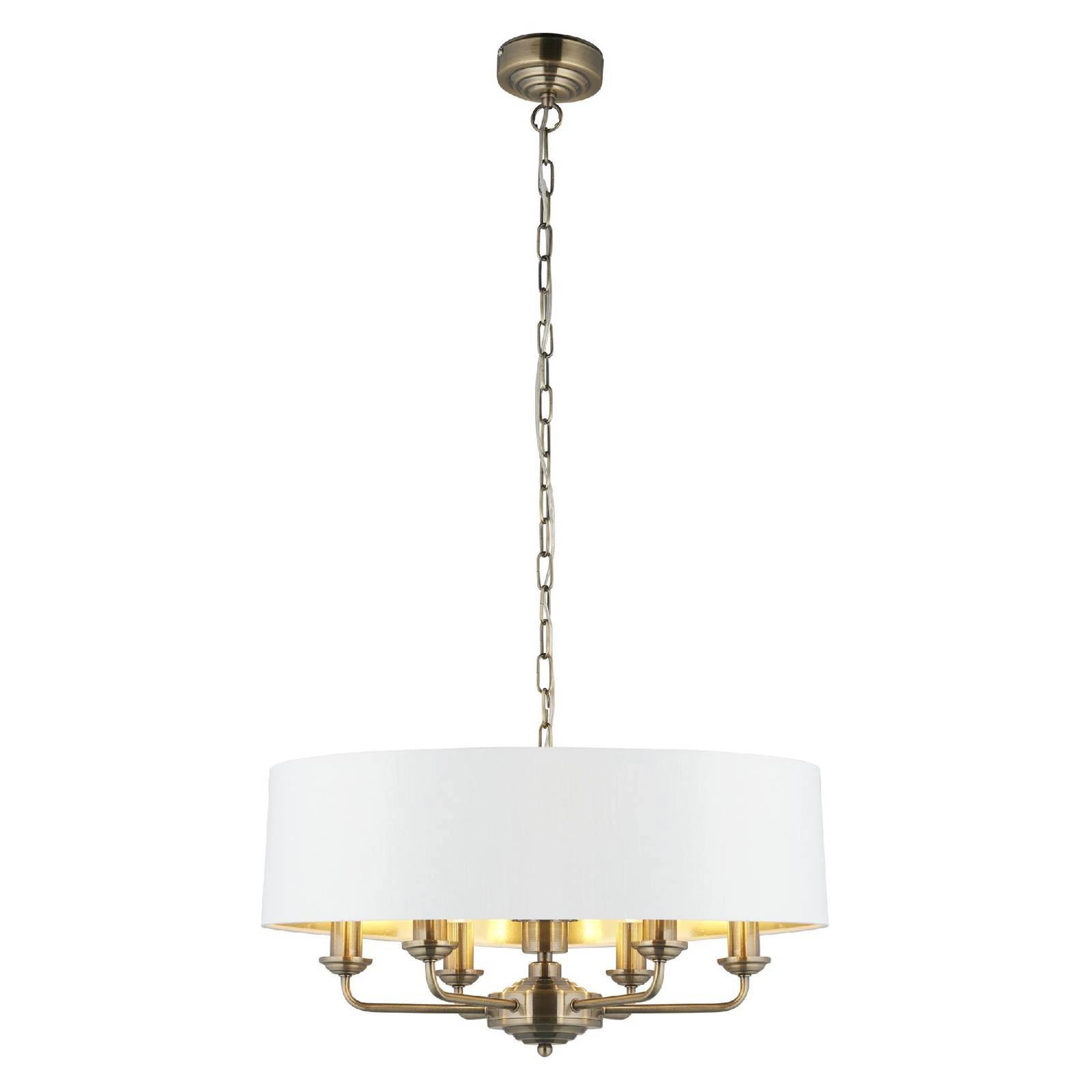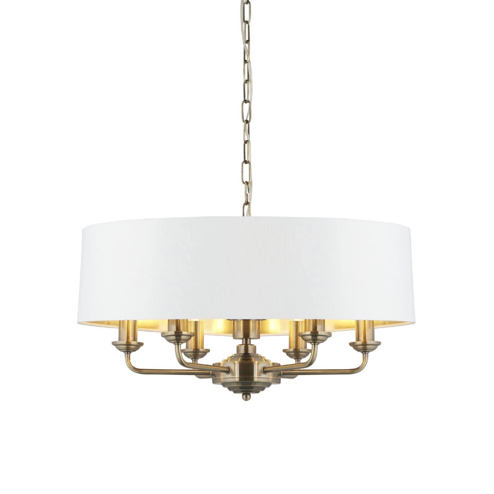 Lampa Wisząca Highclere (98933) marki Endon to elegancka oprawa, która doskonale wpisuje się w różnorodne aranżacje wnętrz. Dzięki swojemu wyjątkowemu stylowi, łączącemu elementy Hampton, klasyczny oraz Art Deco, lampa ta stanie się nie tylko źródłem światła, ale również wyjątkowym elementem dekoracyjnym w Twoim domu. Jej antyczny mosiężny talerz w połączeniu z białą tkaniną w stylu vintage tworzy harmonijną całość, która przyciąga uwagę i nadaje wnętrzu niepowtarzalny charakter.