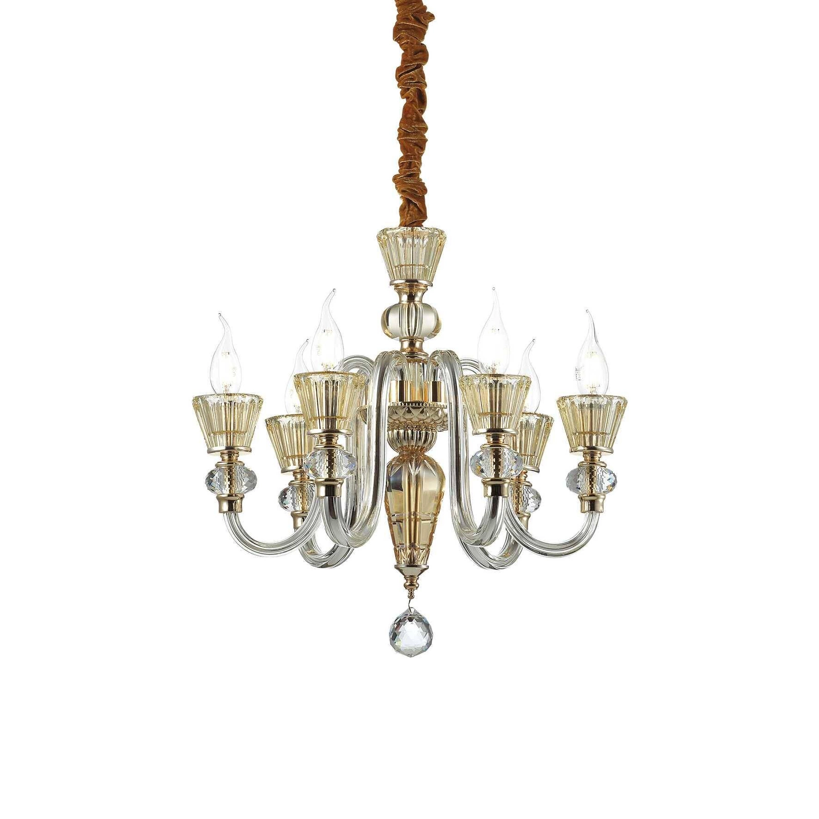 Warto zwrócić uwagę na zastosowane materiały, z których została wykonana ta lampa. Metal oraz szkło w odcieniach srebrnym, złotym i bursztynowym oddają klasyczny charakter żyrandola, a jednocześnie wpisują się w aktualne trendy w aranżacji wnętrz. To idealne rozwiązanie dla tych, którzy cenią sobie klasyczne akcenty oraz eleganckie detale w swojego otoczeniu.