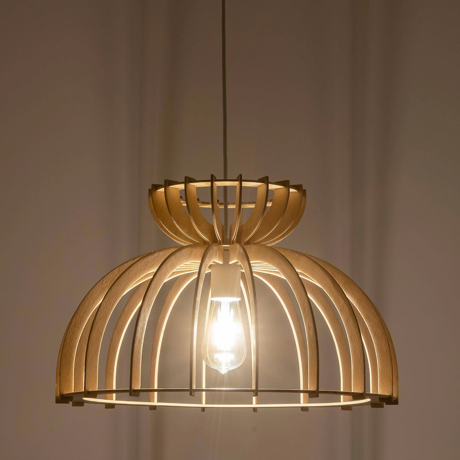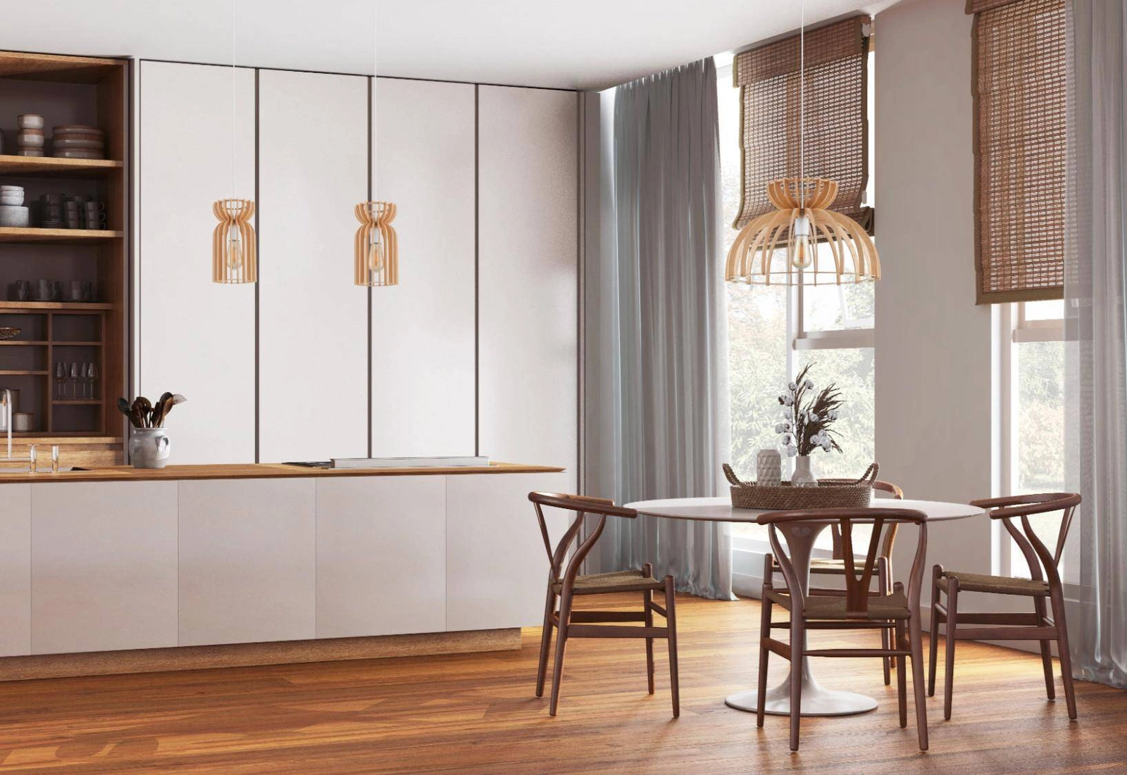 Jednym z najważniejszych elementów tej lampy wiszącej do jadalni jest jej minimalistyczny, a zarazem stylowy design. KYMI C harmonijnie łączy elementy drewniane ze stalowymi, co czyni ją idealnym rozwiązaniem dla tych, którzy poszukują designerskich lamp wiszących. Klasyczny kolor biały w połączeniu z drewnem sprawia, że lampa pasuje do każdego wystroju, od industrialnych loftów po eleganckie przestrzenie w stylu boho.